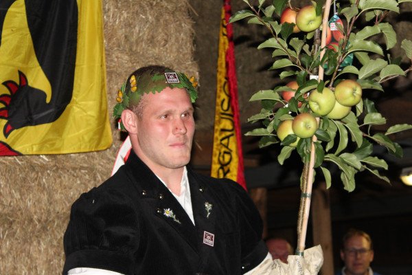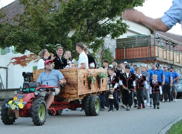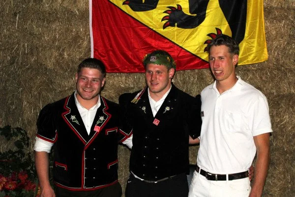 Auf dem elterlichen Hof, wo der Festakt stattfand, zog Tschumi Lukas gemeinsam mit seinem Teamkollegen Neuenschwander Levin und Staub Severin (Schwingklub Langenthal) auf einem Einachser-Anhänger zum Festplatz ein.